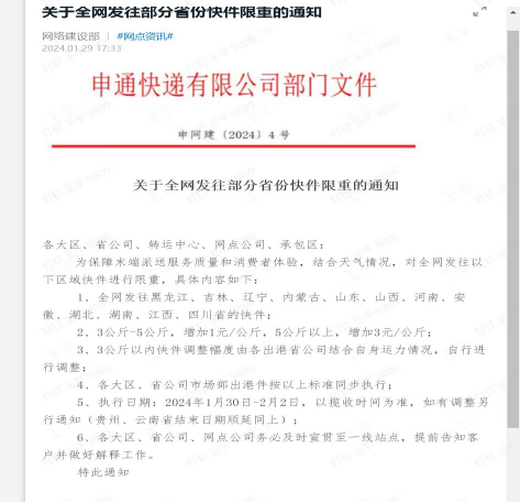 具体来看,记者最新获悉,申通快递近日发布通知,为保障末端派送服务质量和消费者体验,结合当前天气情况,将对发往黑龙江、吉林、江西、湖南、湖北、安徽、四川、河南、山东、山西、内蒙古和辽宁等省份的快件进行价格调整。