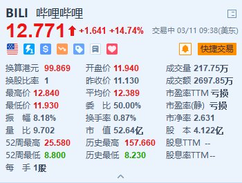 哔哩哔哩(BILI.US)涨14.7%,报12.77美元;H股今日收涨11.6%。哔哩哔哩2023年第四季度净收入63亿元,上年同期为61亿元;毛利率达26.1%,较去年同期的20.3%有所增加;日均活跃用户达1.001亿,较2022年同期增加8%。