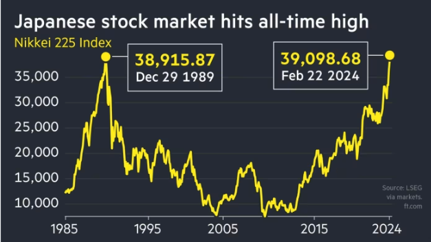 2月22日周四,日经225指数收于39098.68 点,突破1989年底泡沫经济时期创下的盘中高点38957.44,也超过历史收盘高点38915点。