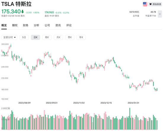 其最新175美元以上的股价,相比2023年末的超过260美元,跌幅超30%。事实上,早在2023年10月公布明显低于市场期望的财务结果那会儿,特斯拉的股价就曾发生过一次幅度达到23%的股价下跌。