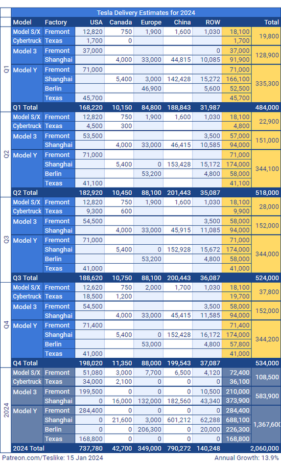 最后附上预测。结合目前特斯拉全球的降价举措和销量趋势,特斯拉2024年全年的业绩实在乐观不起来。参考其产能和交付推测数字: