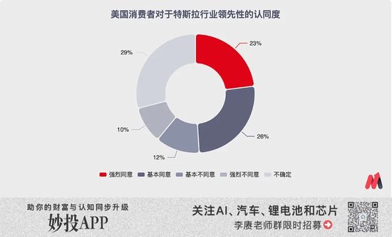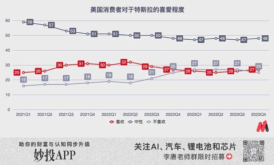 根据美国消费者分析平台CivicScience的调研,特斯拉在2022年下半年之后,在美国消费者心目中,经历了“不喜爱”人群比例的明显增多,对于消费者对于其行业领先性的认同更是只有“一半一半(同意的占49%)”。