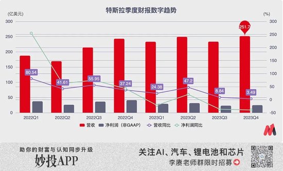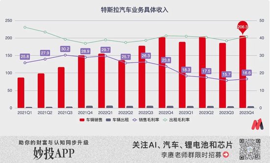 单车层面的利润变化,乘以特斯拉整体庞大的销量,最终导致其2023年汽车销售业务,虽然营收全年增长近17%,毛利率却从去年全年的26.2%下降到17.0%,毛利润总额少了超过40亿美元,公司整体净利润少了32.3亿美元。