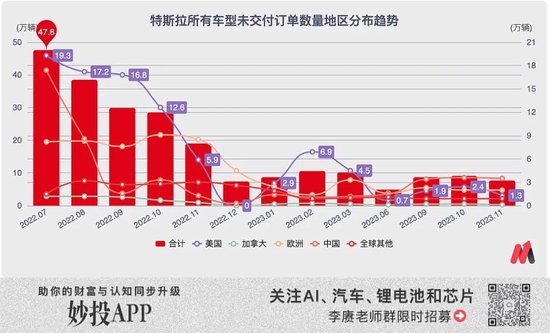 因为特斯拉欧洲地区的库存无法统计整合,所以在特斯拉需求的转变上,我们不妨参考国外特斯拉数据博主Troy Teslike的“推测未交付订单数”口径。可以很明显地看到,特斯拉在4个月的时间跨度里,先后在中国、北美、欧洲遭遇了未交付订单量的大幅下滑: