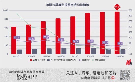 2023年第三、第四连续两个季度的营收同比增长只有个位数,以及净利润的大幅下滑,看起来已经足够“糟糕”。套用笔者常用、更能显示长期趋势的年度滚动值计算方式,特斯拉财务结果的变化趋势更加明显——尽管营收仍在增长,其净利润从2023年第三季度开始,已经迈入实现了滚动值同比为负的新阶段。