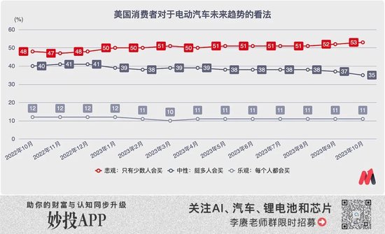 更要命的,是美国消费者对于新能源汽车整体的“不看好”:目前美国汽车消费群体只有11%的消费者对于新能源汽车的未来足够乐观,它们当中很多应该已经成为了特斯拉的用户。在过去的一年多时间里,越来越多中性的消费者开始转向更为悲观的态度。