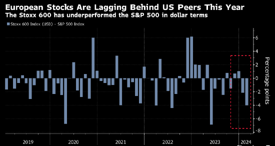 欧洲股市2024年初表现不及美国股市,受制于经济前景普遍更加负面以及企业财报季表现不佳。