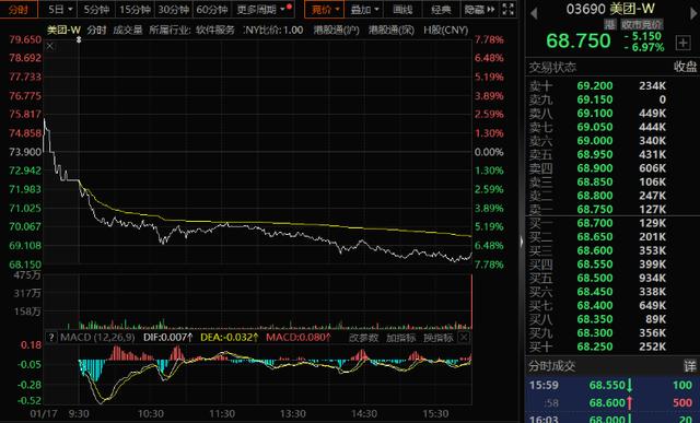 美团再次遭遇大跌。1月17日,港股美团(03690)收盘跌6.97%,报68.75港元,已跌破发行价(上市发行价69港元),创四年来新低。