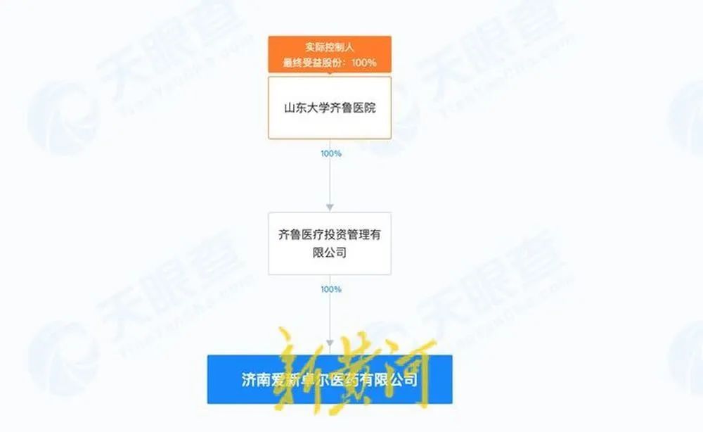 据新特药服务中心的线上购药平台,“爱新卓尔新特药服务中心”微信公众号平台的认证主体显示为山东爱新卓尔大药房有限公司。记者查询天眼查发现,山东爱新卓尔大药房有限公司成立于2016年5月3日,企业唯一股东为齐鲁医疗投资管理有限公司。据天眼查股权穿透信息显示,齐鲁医疗投资管理有限公司由山东大学齐鲁医院100%控股,注册资本4245万元。